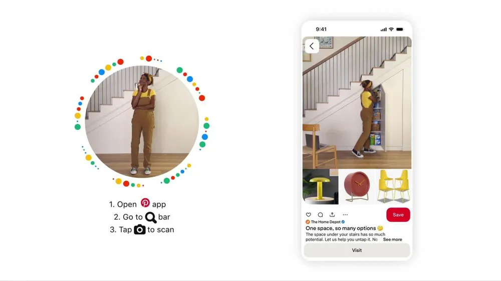 Alt text: A woman with short dark hair in an orange jacket stands confidently against a vibrant, abstract background with flowing shapes in pink, green, and white.