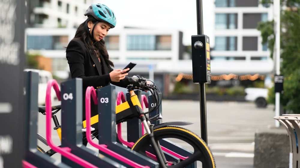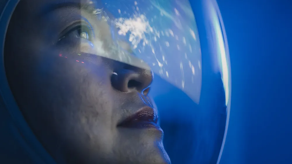 Alt text: A woman with short dark hair in an orange jacket stands confidently against a vibrant, abstract background with flowing shapes in pink, green, and white.